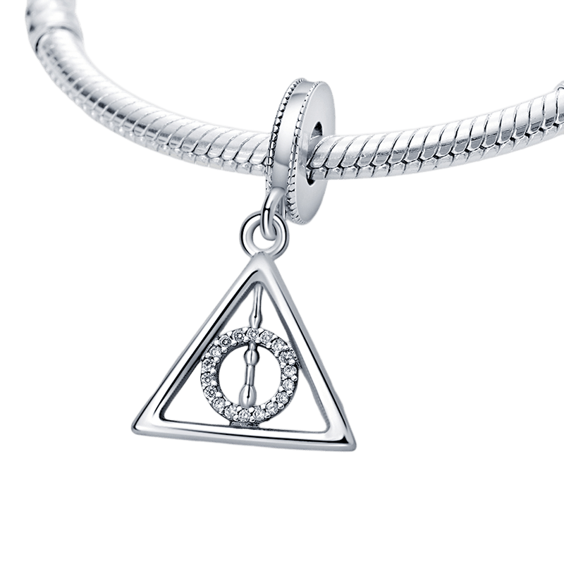 Harry Potter Ölüm Yadigarları Sallantılı Charm ile büyücülük dünyasının en güçlü ve gizemli sembollerinden birini taşıyın. Efsanevi üçlü büyülü eseri -Mürver Asa, Diriltme Taşı ve Görünmezlik Pelerini- temsil eden bu tılsım, büyücülük bilgisinin özünü göz alıcı ve detaylı bir tasarımla yakalıyor. Ölüm Yadigarları'nın üçgen şekli, merkezinde ışıltılı taşlarla bezeli bir daire bulunan titizlikle işlenmiş olup, hem sembolik hem de göz alıcıdır.